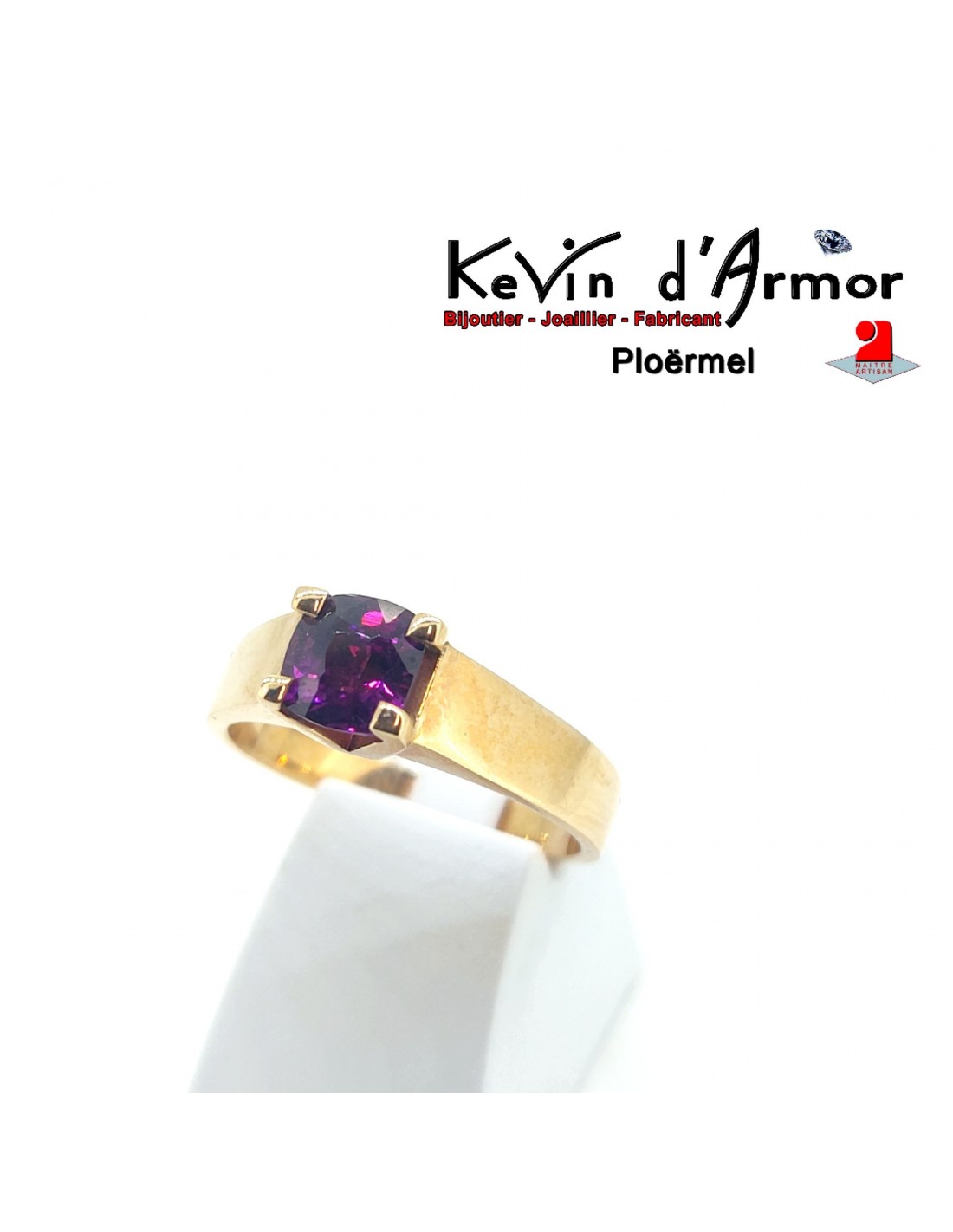 Élégante et chaleureuse, cette bague en or jaune 750‰ met en lumière un superbe grenat taille coussin de 1,31 ct, dévoilant un violet rosé lumineux et soutenu. La profondeur de sa couleur, rare et envoûtante, crée un contraste exquis avec l'éclat solaire de l'or jaune, offrant au bijou une présence vibrante et résolument précieuse.