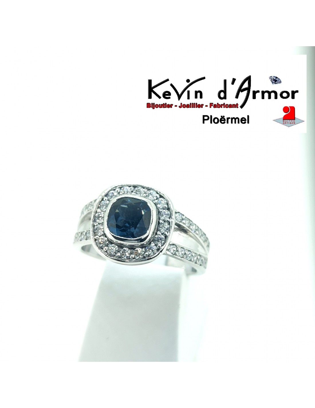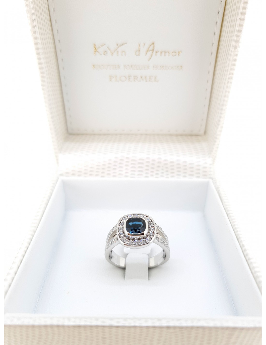 Un halo d'oxydes de zirconium vient sublimer la gemme centrale, tandis que le corps en or blanc palladié 750°/°° apporte une touche contemporaine et lumineuse.