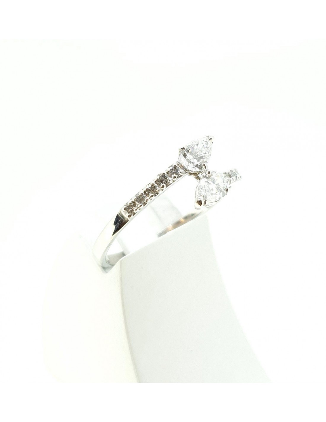 Deux diamants taille poire se font face dans une élégante harmonie, rehaussés de délicats diamants ronds pavés sur l'anneau.