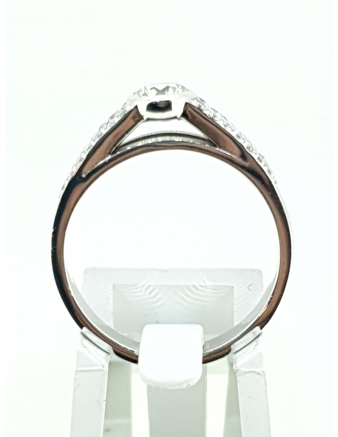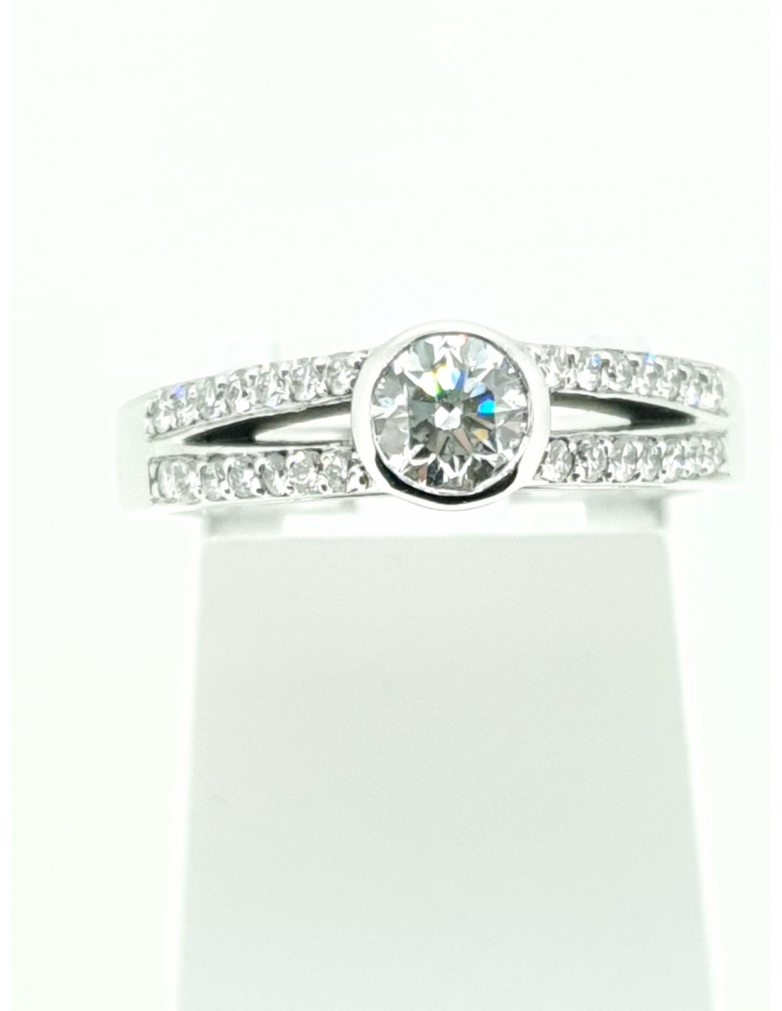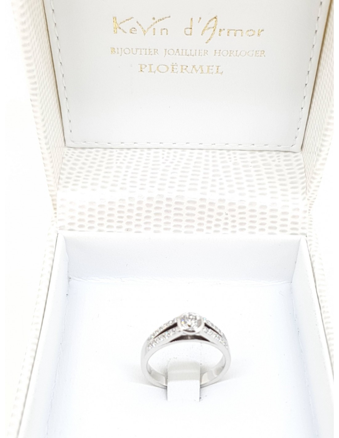 Raffinée et intemporelle, cette bague en or blanc palladié 750°/°° se distingue par son diamant central serti clos, sublimé par deux descentes scintillantes.