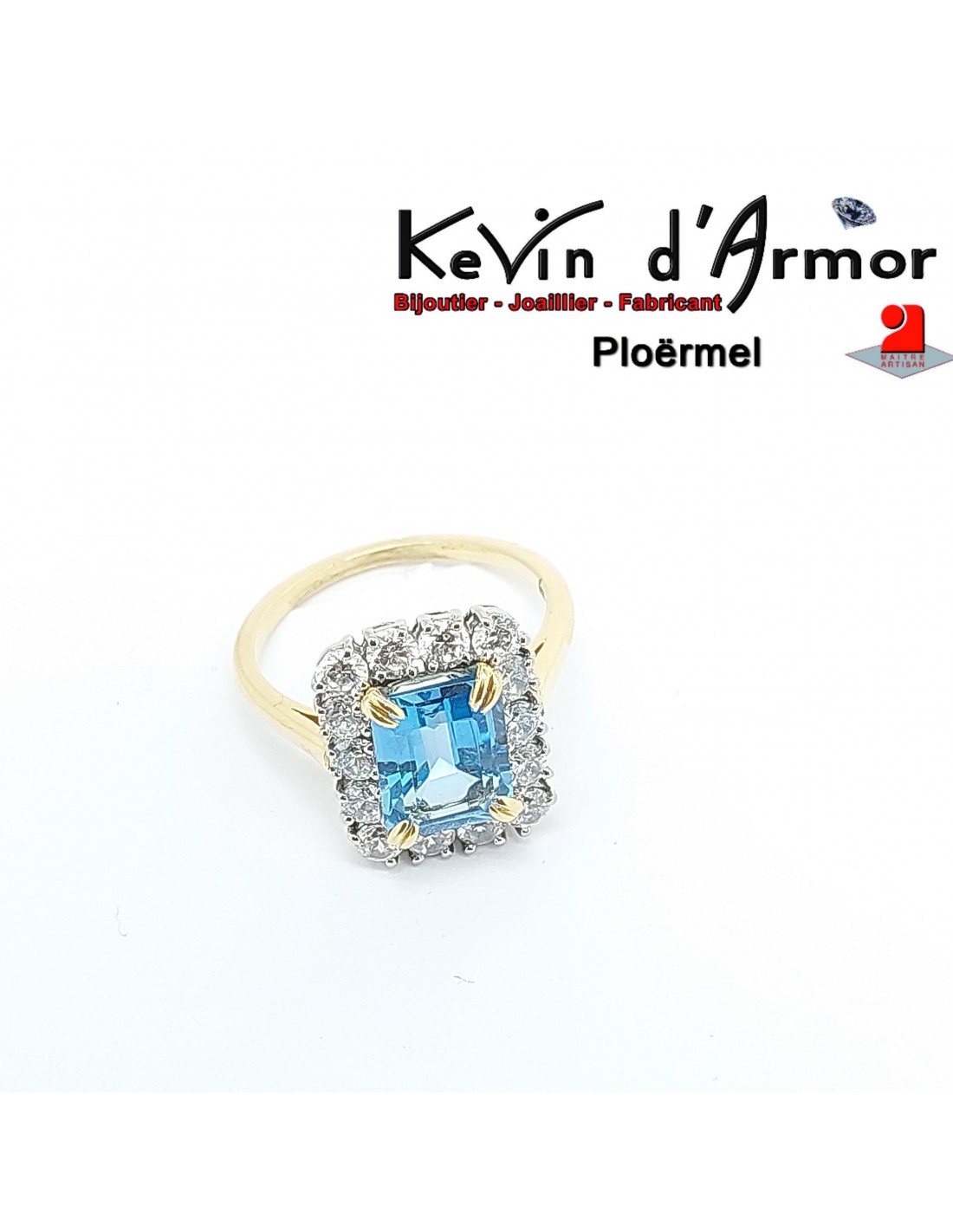En son centre trône une magnifique aigue-marine taille rectangle à pans coupés de 9,10 × 7 mm (2,2 ct), dont la transparence cristalline est sublimée par un entourage d'oxydes de zirconium de 2,6 mm.