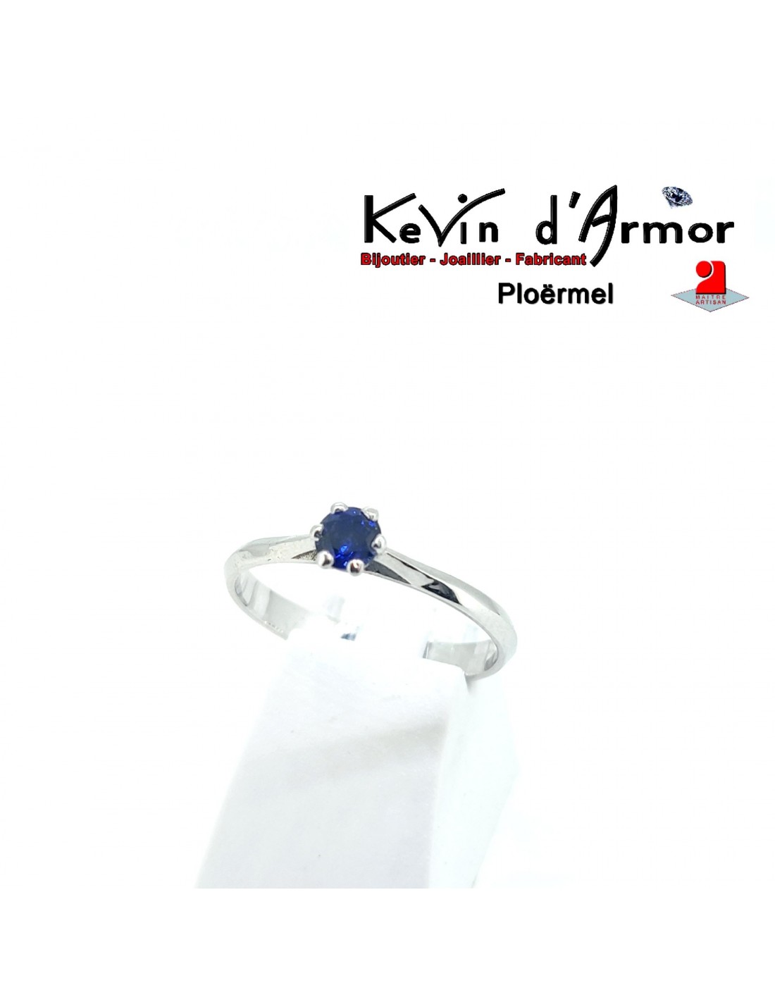 Élégante et intemporelle, cette bague solitaire en or blanc palladié 750°/°° met en valeur un saphir bleu rond de 4 mm, d'une couleur très soutenue, sublimé par un sertissage à six griffes qui assure sécurité et éclat maximal.