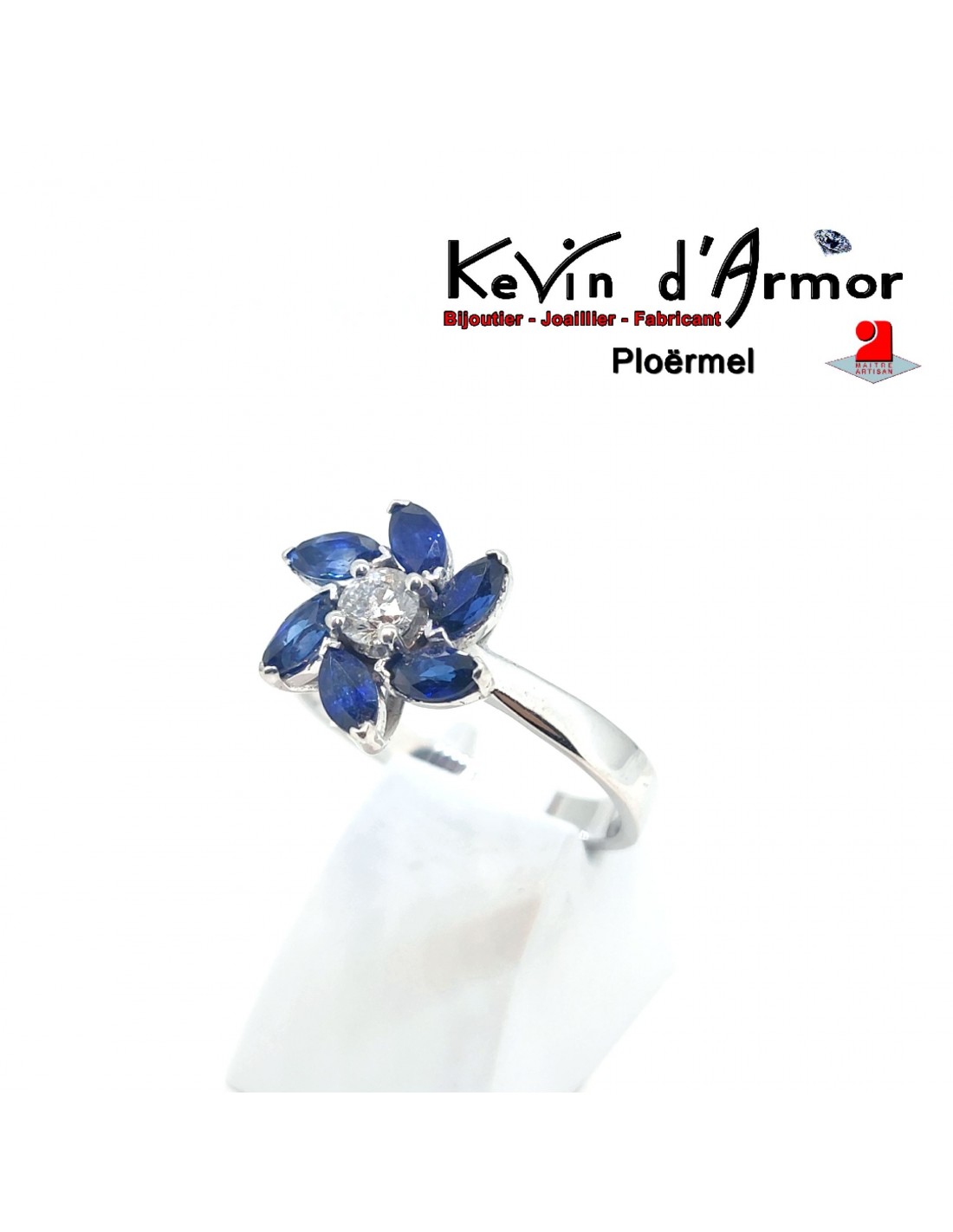 En son coeur, un diamant naturel étincelant capte la lumière avec brio, entouré de saphirs bleus taillés en forme navette, rappelant de délicats pétales.