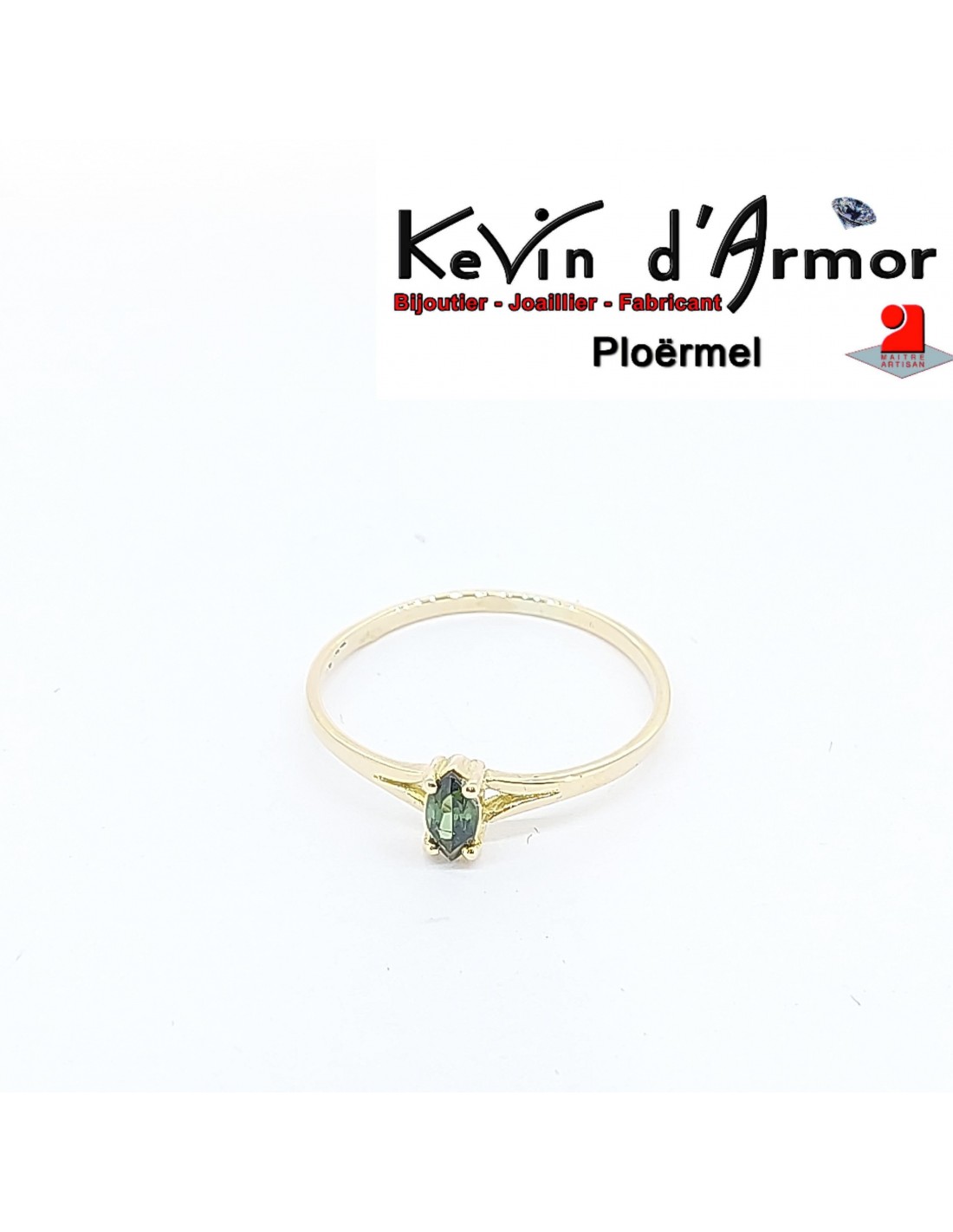 Naturelle et raffinée, cette bague en or jaune 750°/°° est ornée d'une tourmaline verte taillée en navette, pierre de sérénité et d'harmonie.