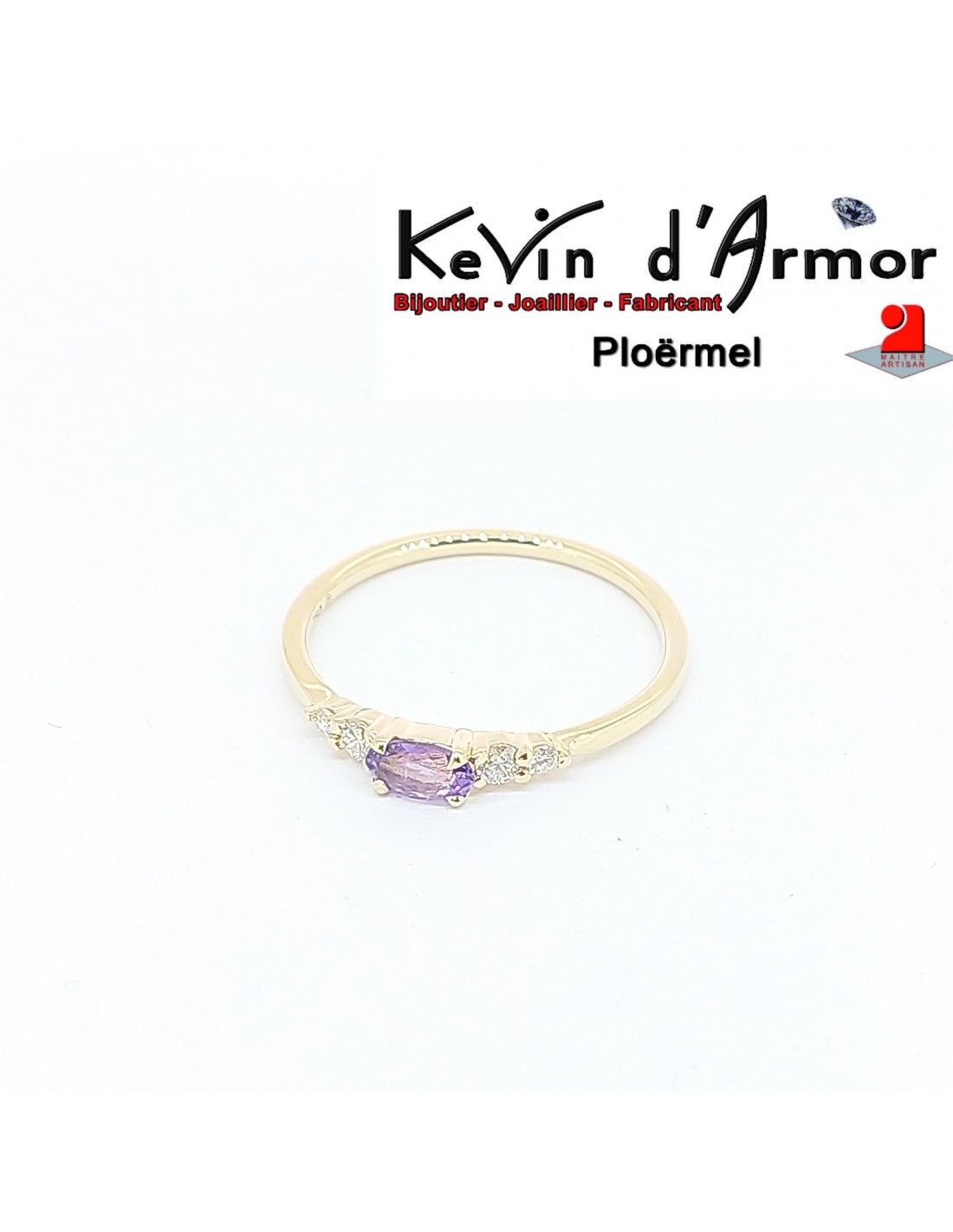Éclatante de féminité, cette bague en or jaune 750‰ met en valeur une améthyste ovale de 0,19 carat, aux reflets violets subtils et envoûtants. De chaque côté, deux diamants totalisant 0,11 carat ajoutent une touche de brillance et subliment la couleur vibrante de la pierre centrale.