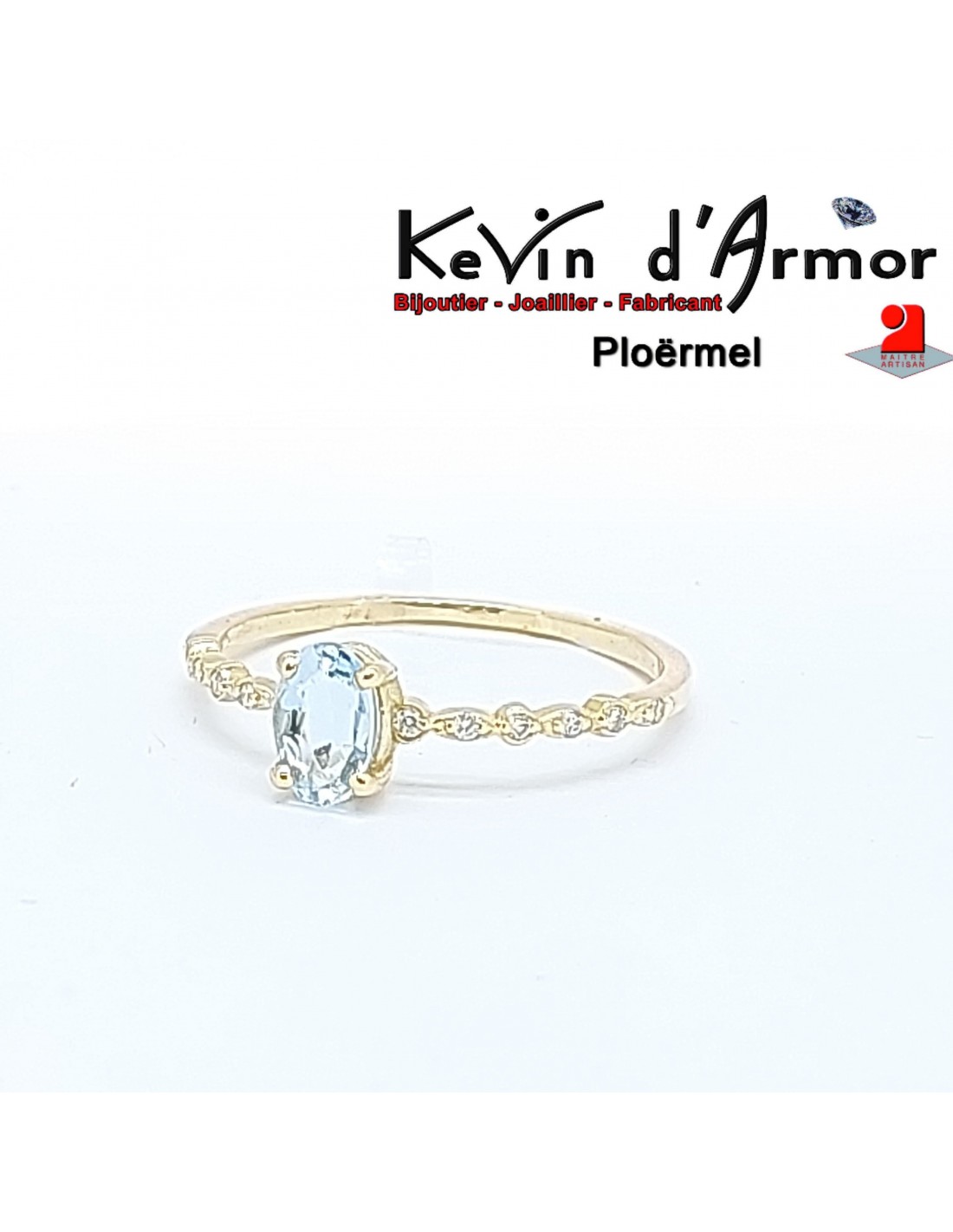 Élégante et lumineuse, cette bague en or jaune 750‰ met en valeur une aigue-marine ovale, délicatement sertie pour laisser rayonner son bleu clair et pur.