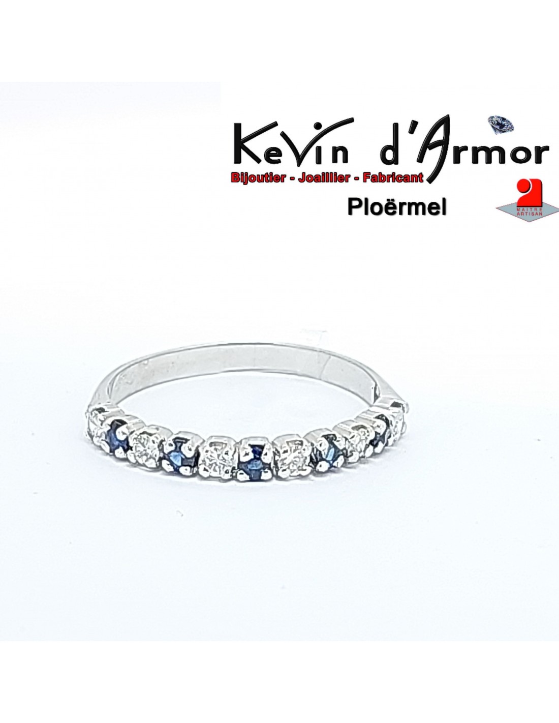 Élégante et lumineuse, cette demi-alliance en or blanc palladié 750°/°° alterne harmonieusement six diamants naturels et cinq saphirs de 2 mm, créant un jeu d'éclats subtil et raffiné.