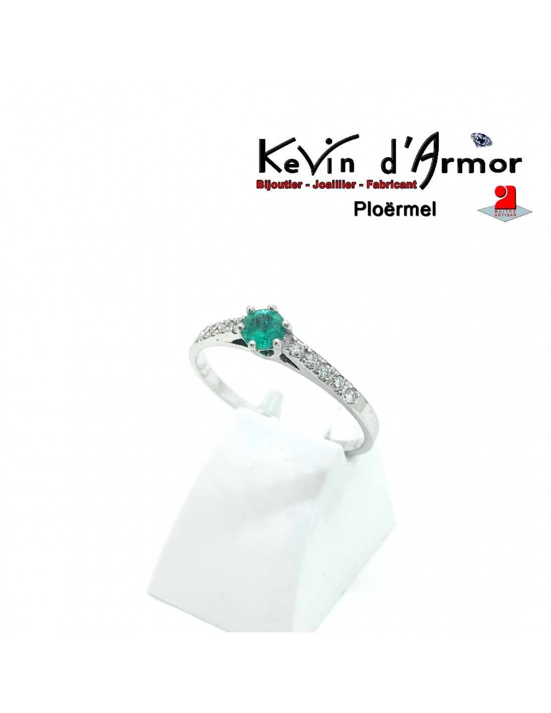 Solitaire en or blanc palladié, Emeraude centrale accompagnée de diamants 0.15 cts