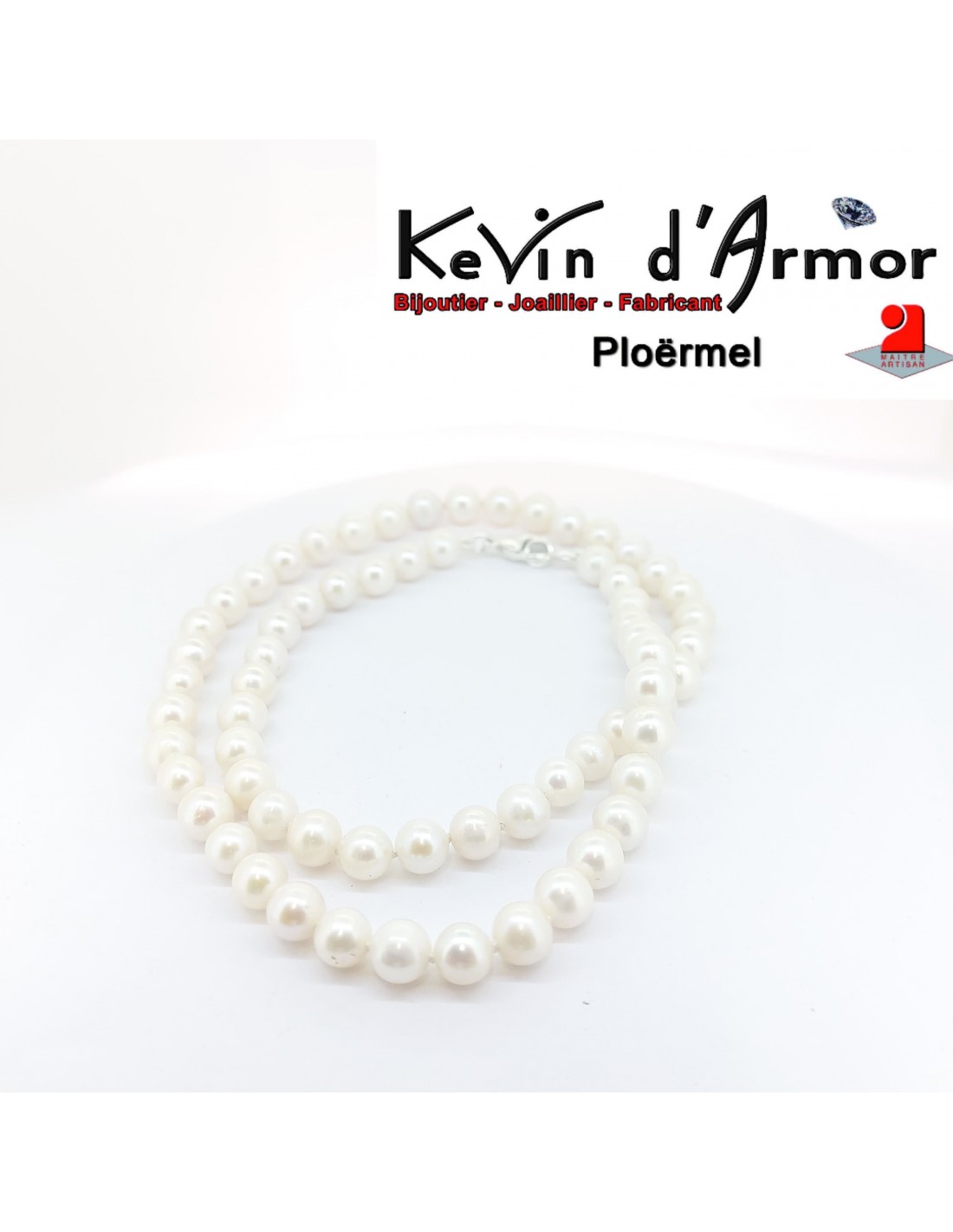 Collier perles de culture blanches montées sur fil de soie avec noeuds.