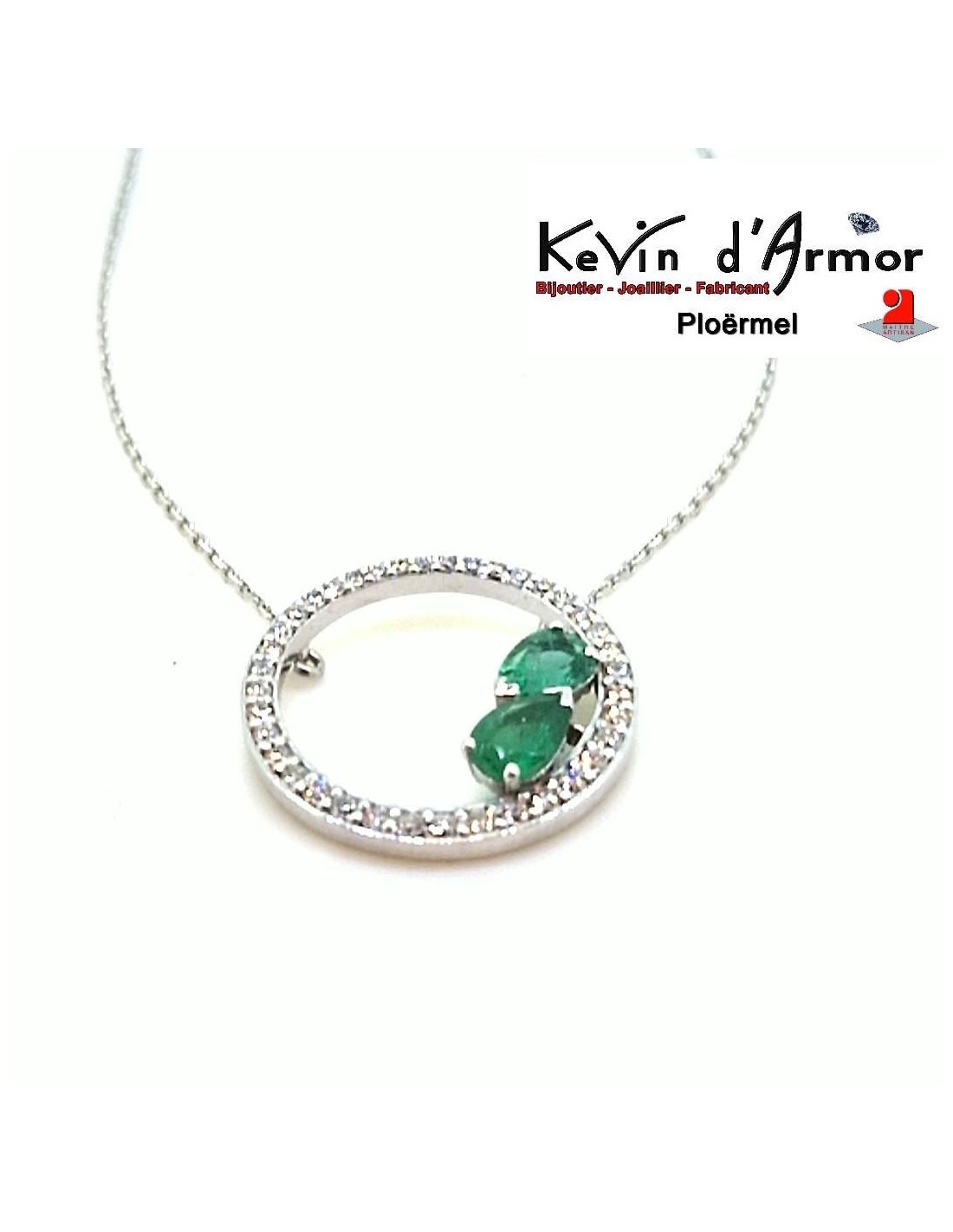 Ce collier d'exception allie élégance et éclat intemporel. Réalisé en or blanc palladié 750°/°°, ce pendentif formé d'un cercle serti de diamants naturels étincelants, met en lumière deux émeraudes naturelles d'un vert profond et lumineux. Leur éclat vibrant symbolise la renaissance et la pureté, contratant harmonieusement avec la brillance cristalline des diamants.