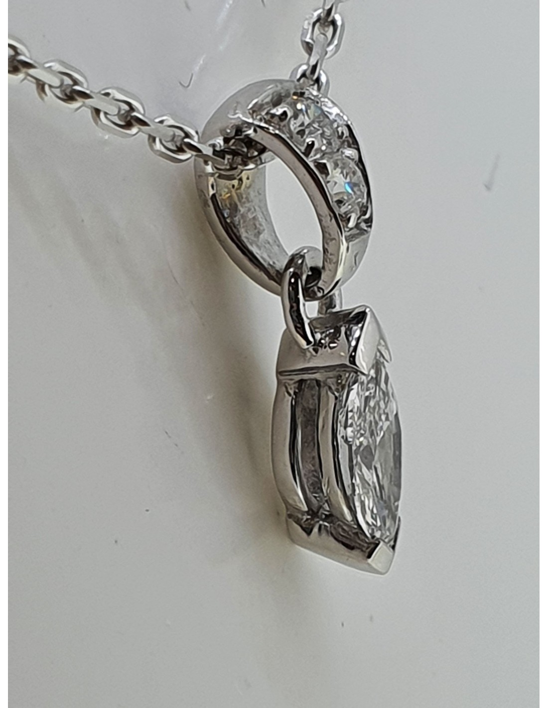En son centre scintille un diamant taille navette de 7.6 x 3.3 mm, savamment serti pour mettre en valeur sa silhouette élancée et sa brillance exceptionnelle. Il est accompagné de deux diamants ronds de 2 mm, harmonieusement disposés sur la bélière, ajoutant une touche supplémentaire d'éclat et de prestige.